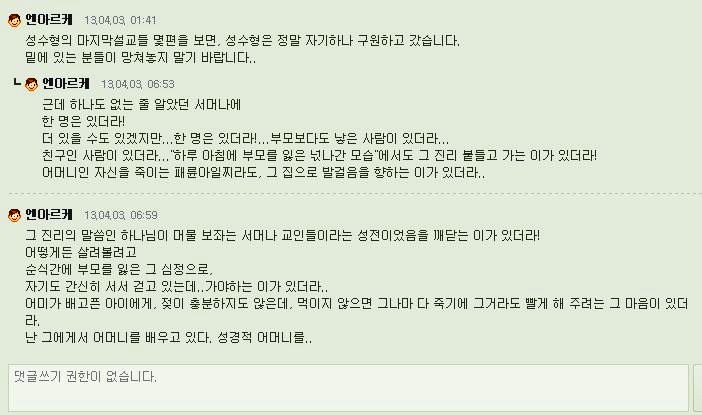 ¾Æ·¡ÀÇ ´ñ±ÛµéÀº ¼¿ï ¼¸Ó³ª±³È¸¿¡ Ãâ¼®Çϰí ÀÖ´Â ¾î¶² À̵é°ú ³ª´« ´ëÈÀÔ´Ï´Ù.